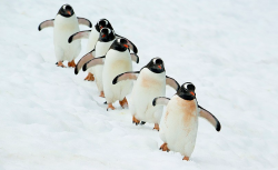 waddle - To walk with short steps and a clumsy swaying motion