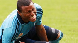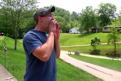 grimace - To make an an ugly, twisted expression on a person's face, typically expressing disgust, pain, or wry amusement