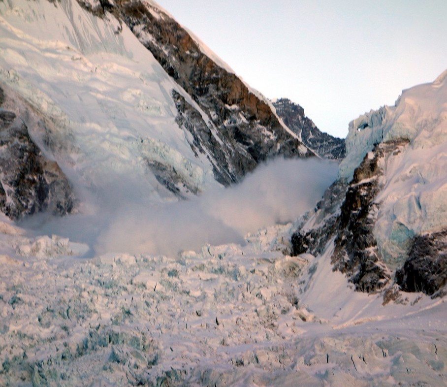 avalanche - A mass of snow, ice, and/or rocks that fall rapidly down a mountainside.